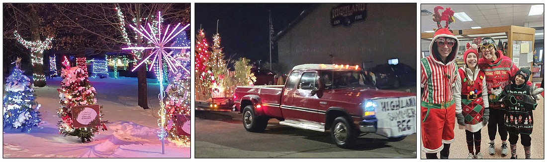 This year the kick off to "Holidays in Highland" was the Highland High School carollers sharing songs Friday night. Saturday started with the craft show, a Jingle Jog (new this year), lunch and evening activities in the park. In the park area there were Memory Trees, wine tasting, photos with Santa, eats and parade at 6:00. Many braved the cold to see brightly lit floats from Santa on the Highland Volunteer Fire Department fire truck, Park/Recreation tree float (center photo), Otter Creek Construction Grinch float, and several others plus dressed up walkers.