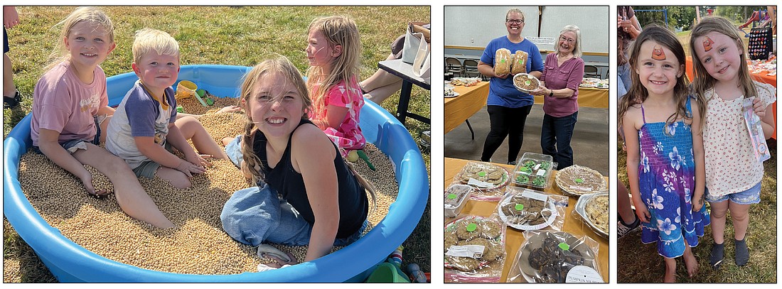 Above left a group of yougsters (l-r Everly Taylor, Irah Thuli, Maizah Thuli and Bethany Turner) have fun in the corn pit. Then Mel Scheckel (left) and Diane Katalenich show off some the homemade baked goods for sale. At right two youngsters (l-r Jenna Marten and Annika James) had tattoos on their foreheads.
